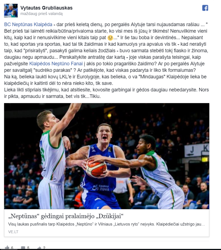 Jis socialiniame tinke „Facebook“ pasidalijo Klaipėdos krašto naujienų portalo straipsniu, kuriame rašoma apie „Neptūno“ pralaimėjimą ir retoriškai užklausė, kaip krepšininkai pažiūrės sirgaliams į akis.