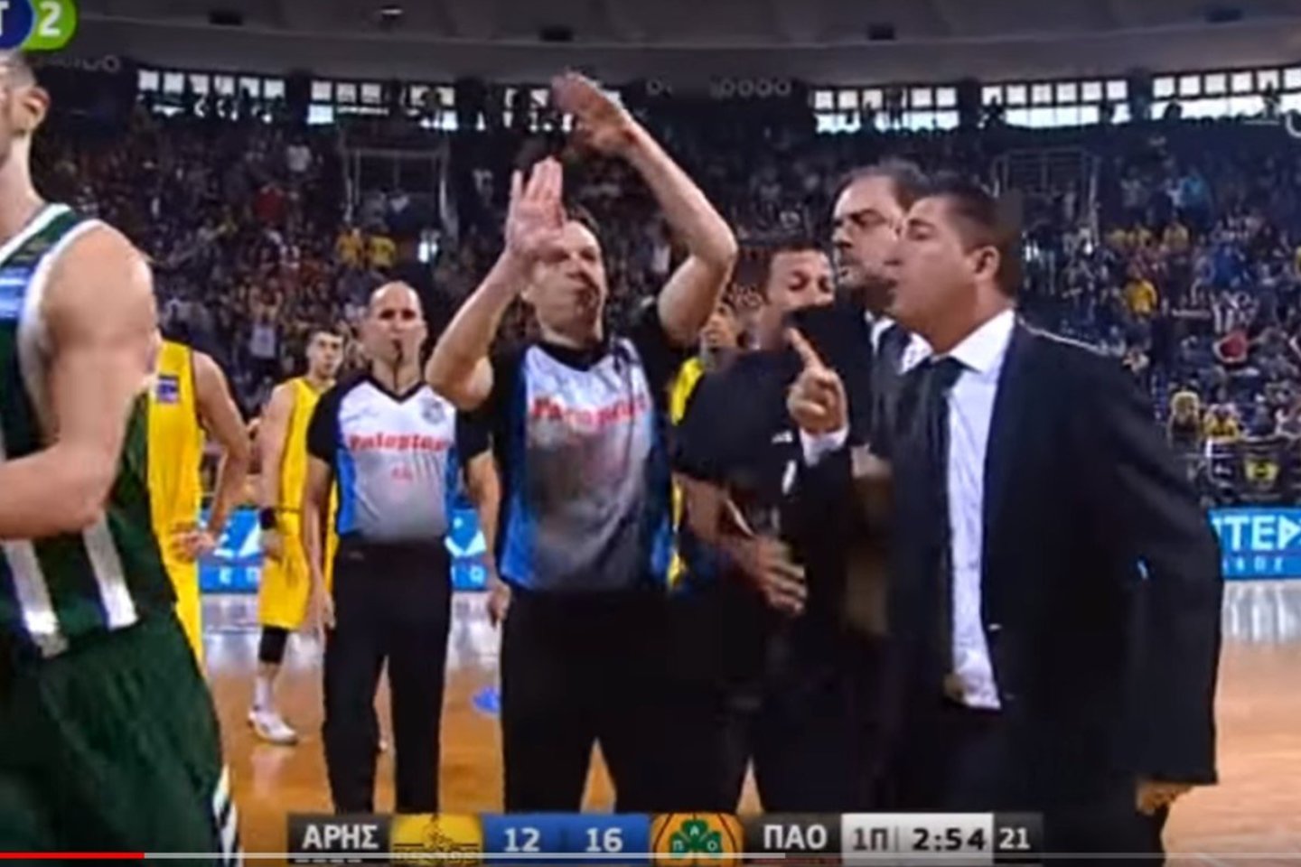 Neeilinis epizodas įvyko likus 3 minutėms iki pirmojo kėlinio pabaigos, kai „Panathinaikos“ klubui svečiuose pirmaujant 16:12, vienam jų lyderių Nickui Calathesui buvo skirta asmenine pražanga, o už ginčus su teisėju šis krepšininkas dar nubaustas ir technine pražanga.