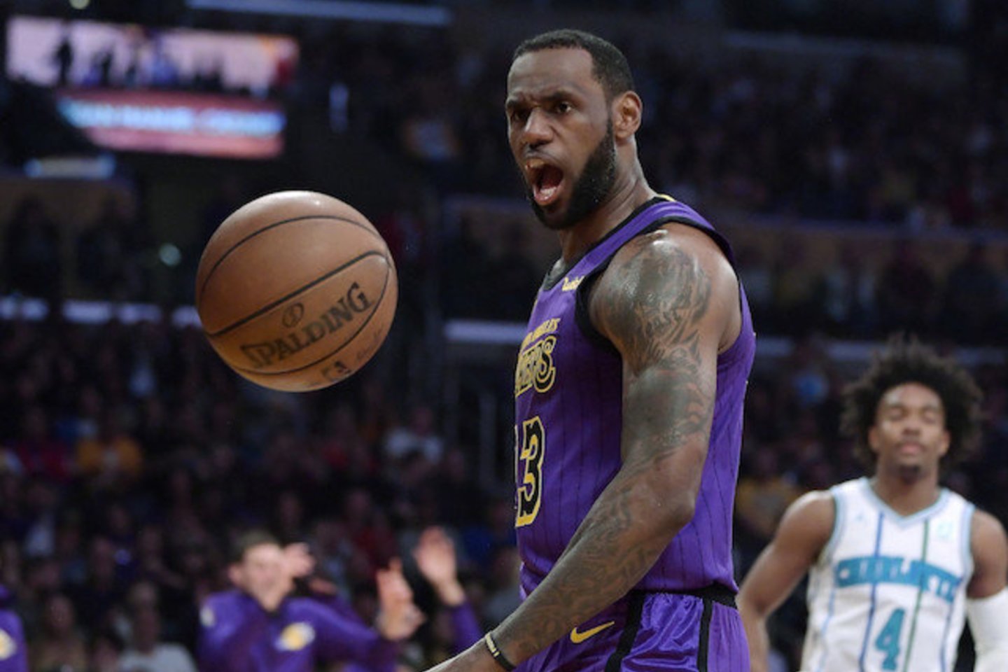 LeBronas Jamesas pelnė 27 taškus ir atliko 9 rezultatyvius perdavimus, Kentaviousas Caldwellas-Pope'as įmetė 25 taškus, o „Lakers“ nutraukė svečių iš Šarlotės keturių pergalių iš eilės seriją.