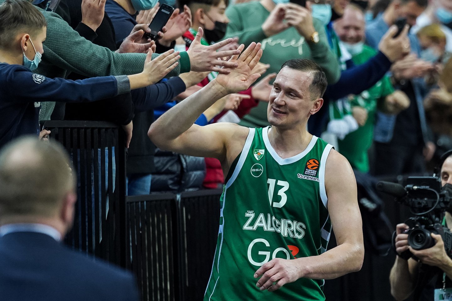 Apskirtai „Žalgirio“ kapitonas savo atsisveikinimo rungtynėse per 17 minučių įmetė 13 taškų (1/4 dvit., 2/3 trit., 5/6 baud.), atkovojo 7 kamuolius ir surinko 17 naudingumo balų.