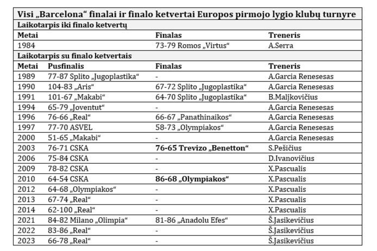 Nuo tada, kai Barselonos krepšininkus 2020 metais pradėjo treniruoti Šarūnas Jasikevičius, jie visus tris sezonus pateko į finalo ketvertą. Tačiau Šarui pakeisti lemties taip pat nepavyksta. Užpernai „Barcelona“ pralaimėjo finalo rungtynes, pernai ir šiemet pusfinalyje dukart paeiliui pripažino Madrido „Real“ pranašumą.