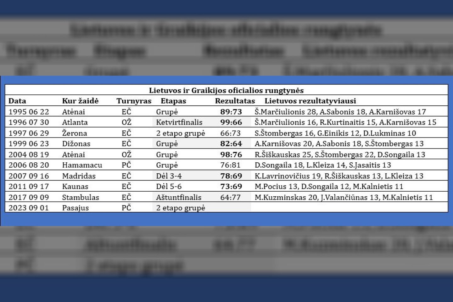 1995 metais Atėnuose lietuviai įveikė graikus 89:73 (Š.Marčiulionis 28, A.Sabonis 18, A.Karnišovas 17).