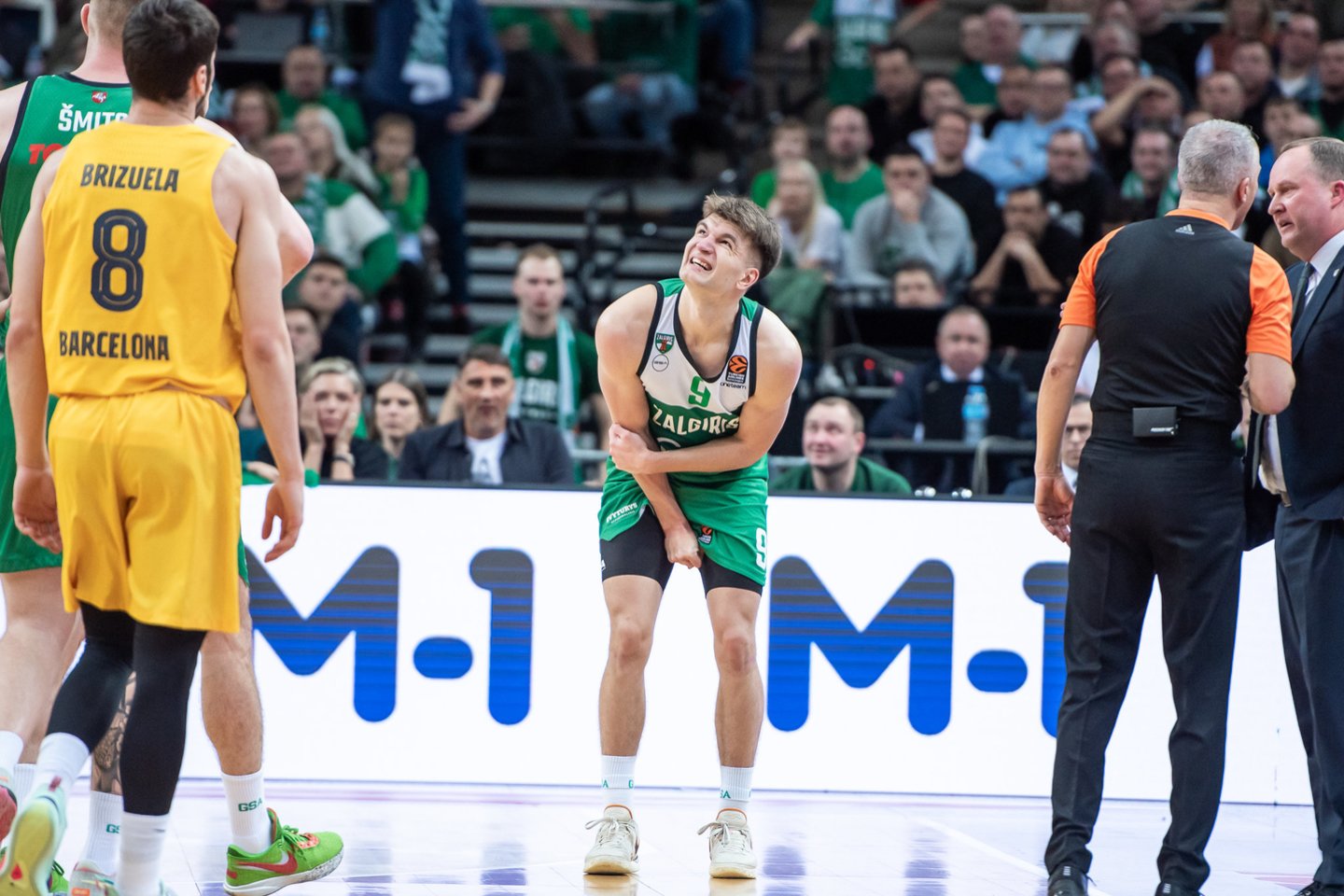 Susižeidęs krepšininkas tąsyk susiėmęs už alkūnės nukulniavo atsarginių žaidėjų suolelio link.