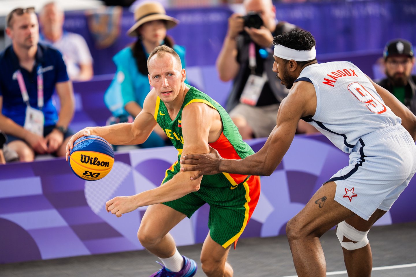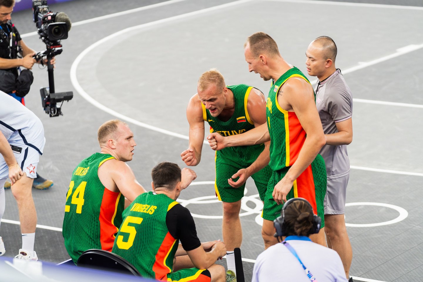 Debiutantė Lietuvos trijulių krepšinio rinktinė olimpiadą pradėjo dviem pralaimėjimais – latviams nusileista 14:21, o šeimininkams prancūzams – 20:21, nors rungtynių pabaigoje D.Novicko komanda ir turėjo tobulą progą išplėšti pergalę.