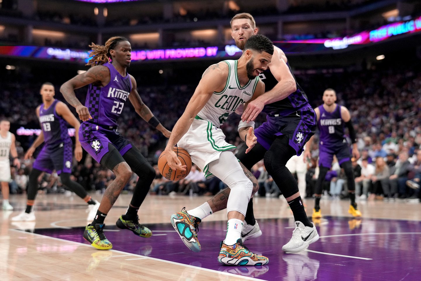 Trečiojo kėlinio metu gindamasis prieš „Celtics“ superžvaigždės metimą lietuvis įšoko į metiko cilindrą ir amerikietis nusileido ant D.Sabonio kojos. J.Tatumas iš karto krito ant žemės ir skausmo persmelktu veidu iškart susigriebė už čiurnos.