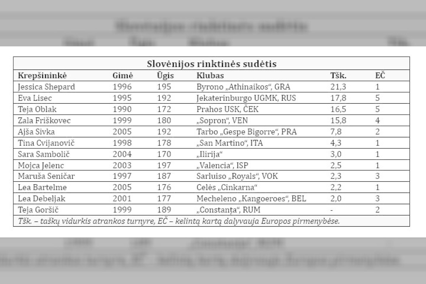 Paminėti bent vieną Slovėnijos krepšininkę buvo daug sudėtingesnė užduotis. Nors Liublianos „Ježica“ klubas praėjusio amžiaus pabaigoje kelis sezonus žaidė moterų Eurolygoje, šio turnyro favoritėms jokios grėsmės nekėlė, o Slovėnijos moterų krepšinio rinktinė per Europos pirmenybių atrankos varžybas dažniausiai būdavo sustabdoma tolimose baigiamosios dalies prieigose. Krepšininkių, kurios būtų galėjusios sudominti stipriausius Europos klubus, Slovėnija tais laikais neišugdė.