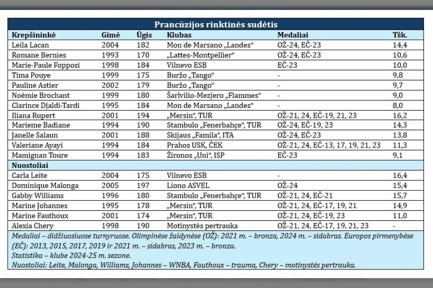 Kitos šešios olimpinius medalius iškovojusios krepšininkės per Europos pirmenybes rinktinės aprangos neapsivilko dėl skirtingų priežasčių: vyriausia olimpinės komandos narė 36-erių Sarah Michel iškart po Paryžiaus žaidynių baigė sportininkės karjerą, Gabby Williams, Marine Johannes ir Dominique Malonga šią vasarą leidžia Šiaurės Amerikoje ir žaidžia WNBA lygoje, Alexia Chartereau-Chery padarė motinystės pertrauką ir sūpuoja gegužės mėnesį gimusį sūnų, o Marine Fauthoux atvyko į treniruočių stovyklą, bet birželio pradžioje per draugiškas rungtynes patyrė sunkią kairiojo kelio traumą.