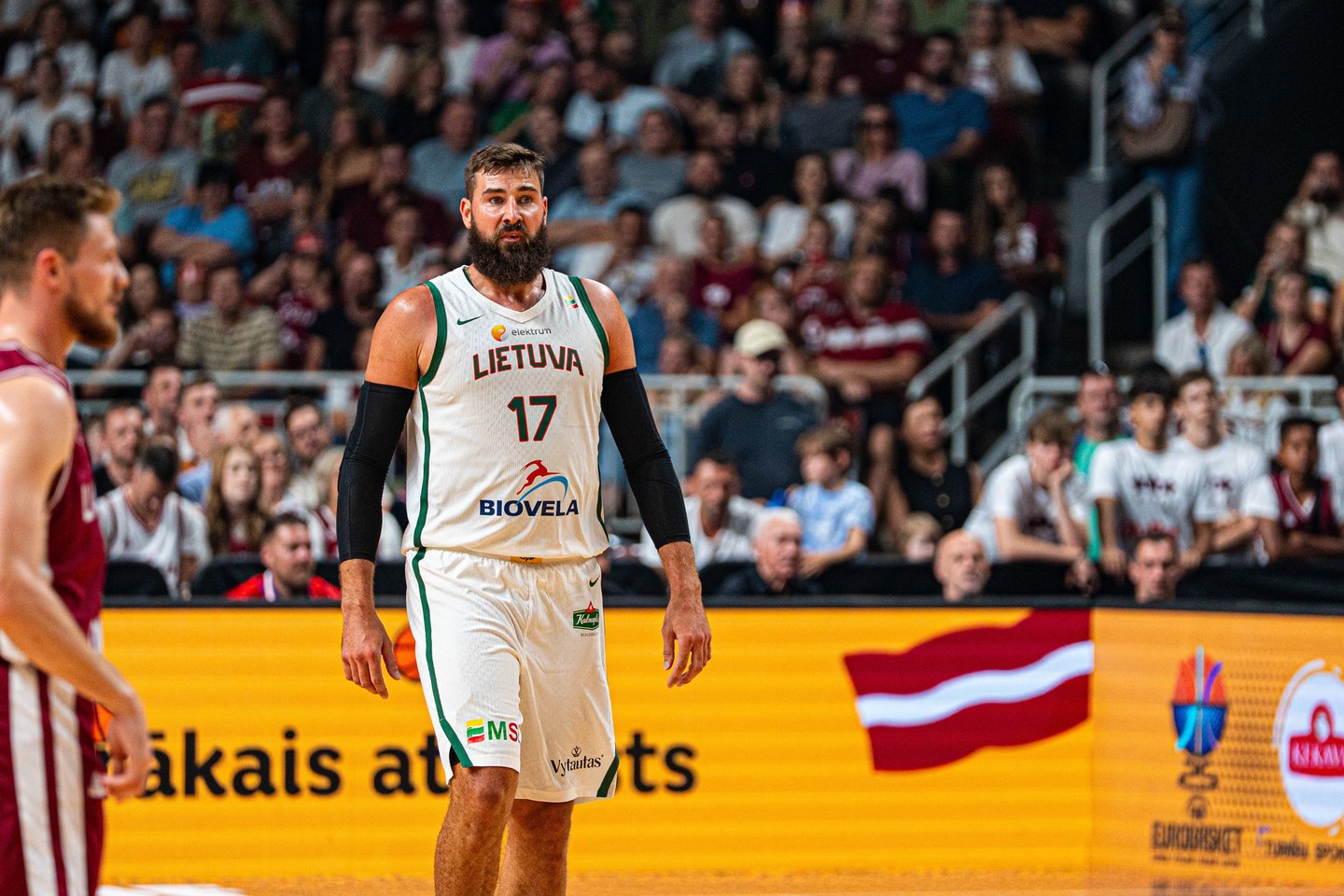 Visgi Rygoje, pilnoje „Xiaomi“ arenoje pasirodė ir pirmosios lietuvių bėdos. Mūsiškiai strigo bandydami stabdyti Latvijos rinktinės snaiperius ir jau po pirmojo kėlinio praleidę 39 taškus mūsiškiai atsilikinėjo dviženkliu skirtumu, o pirmąją pusę latviai užbaigė pirmaudami 59:50.