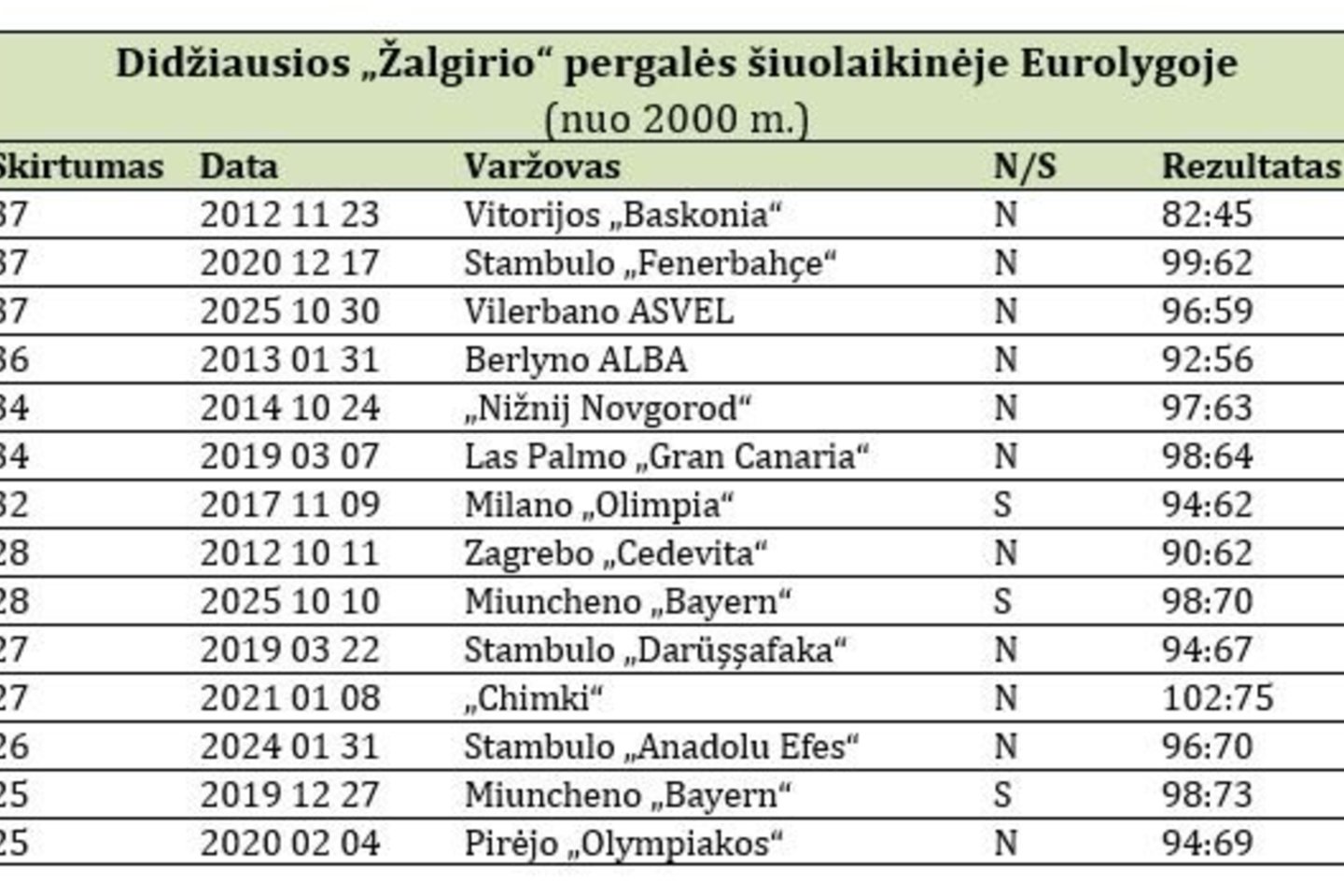 Įdomu, kad Kauno sporto halėje „Žalgiris“ nė karto nelaimėjo ne tik 30 taškų, bet ir 25 taškų skirtumu.