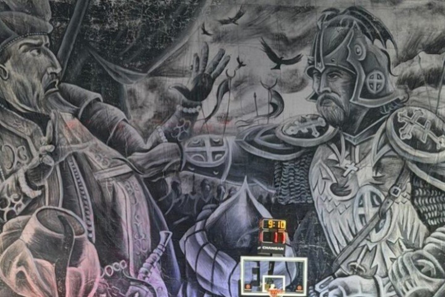 „Partizan“ ekipos aistruolių paruoštame dideliame plakate pavaizduotas momentas, kai nužudomas Osmanų sultonas Muradas I Kosovo mūšyje. Tai padarė serbų riteris Milošas Obiličius.