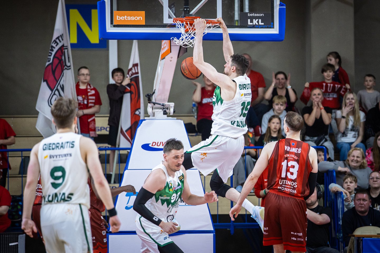 Visgi pirmąją pusę geriau užbaigė Kauno ekipos krepšininkai, o antrąją rungtynių pusę žalgiriečiai pradėjo spurtu 13:0 ir greitai numalšino Utenos sirgalių entuziazmą.