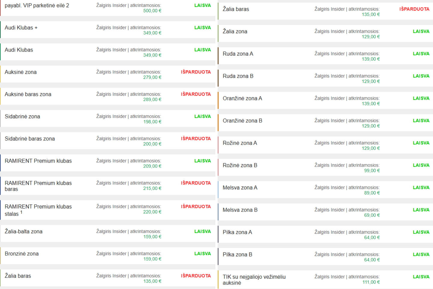 Pačiose geriausiose vietose – auksinėje zonoje ir Audi klube – už bilietą teks pakloti daugiau nei trečdalį minimalios mėnesinės algos: atitinkamai 279 ir 349 eurus.