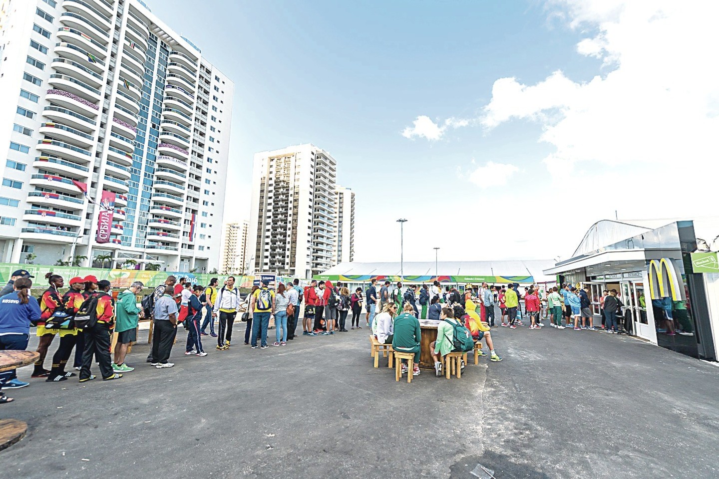 Greitojo maisto restoranas įrengtas lauke, olimpinio kaimelio pakraštyje, o visa atletų banga valgyti suplaukia į milžiniško dydžio palapinę, dirbančią visą parą.