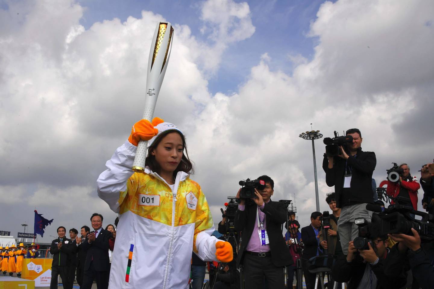 Pietų Korėjos dailiojo čiuožimo žvaigždė Park Hee-jin iškėlė deglą į viršų stebint šimtams žmonių, susirinkusių sostinės Sangamo rajone, kur, likus vos kelioms savaitėms iki olimpiados pradžios, vyko olimpinės ugnies sutiktuvės.