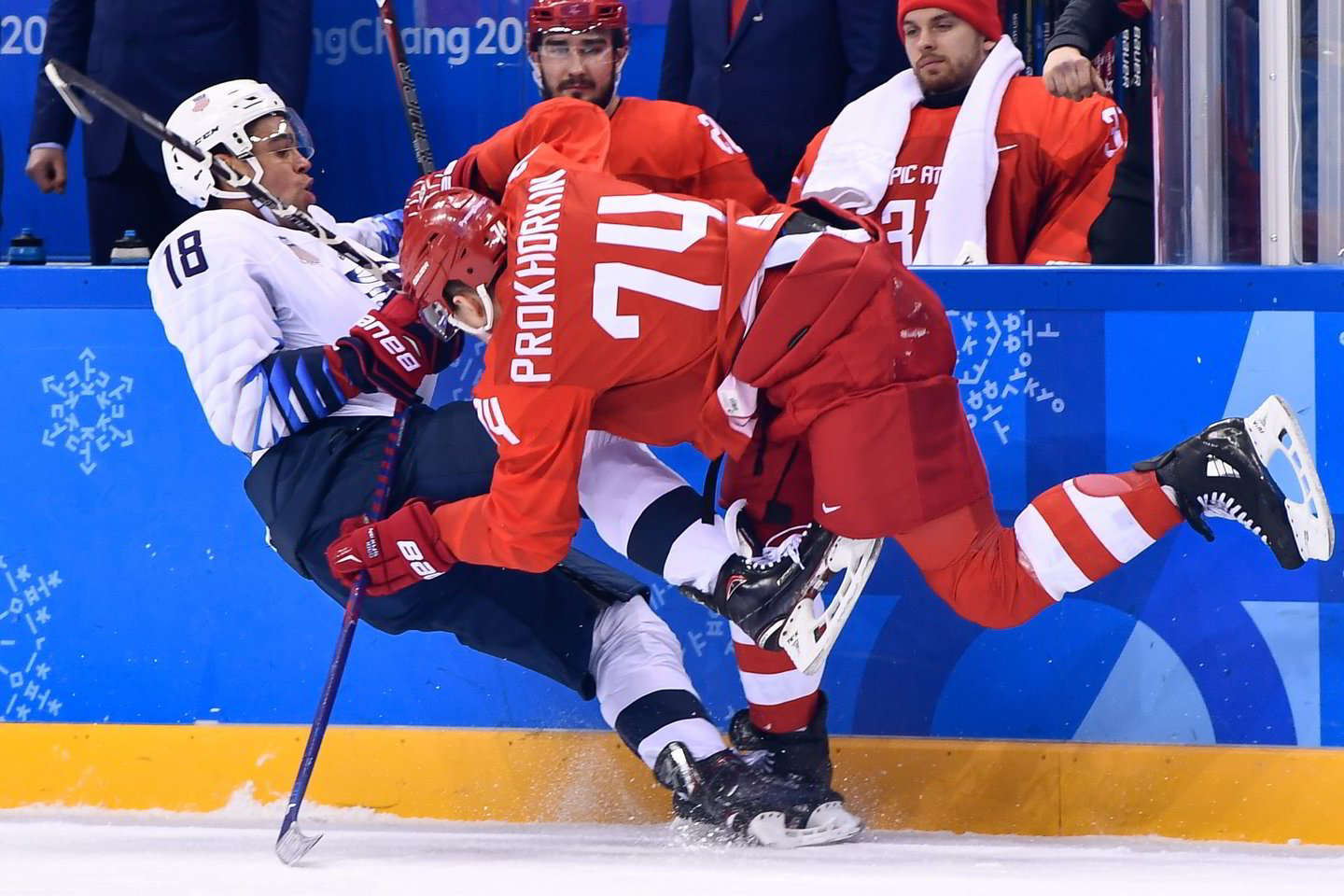 Rusai po dviejų kėlinių pirmavo 3:0, kai po įvartį kiekviename ketvirtyje įmušė Nikolajus Prochorkinas, o Ilja Kovalčiukas sugebėjo nuginkluoti varžovų vartininką paskutinę kėlinio sekundę (39:59 min.).
