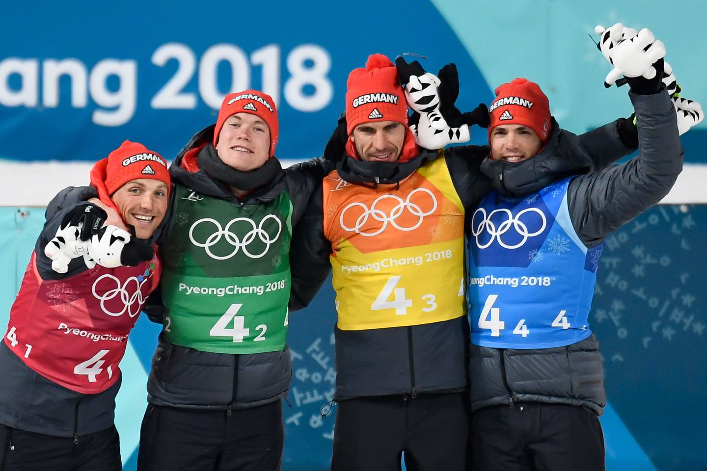 Treti liko Vokietijos atstovai (Erikas Lesseris, Benediktas Dollis, Arndas Peifferis ir Simonas Schemppas). Vokiečiai nuo nugalėtojų atsiliko 2 minutėmis ir 7,1 sekundės. Jie turėjo įveikti net 3 baudos ratus ir atliko 10 papildomų šūvių (3+10).