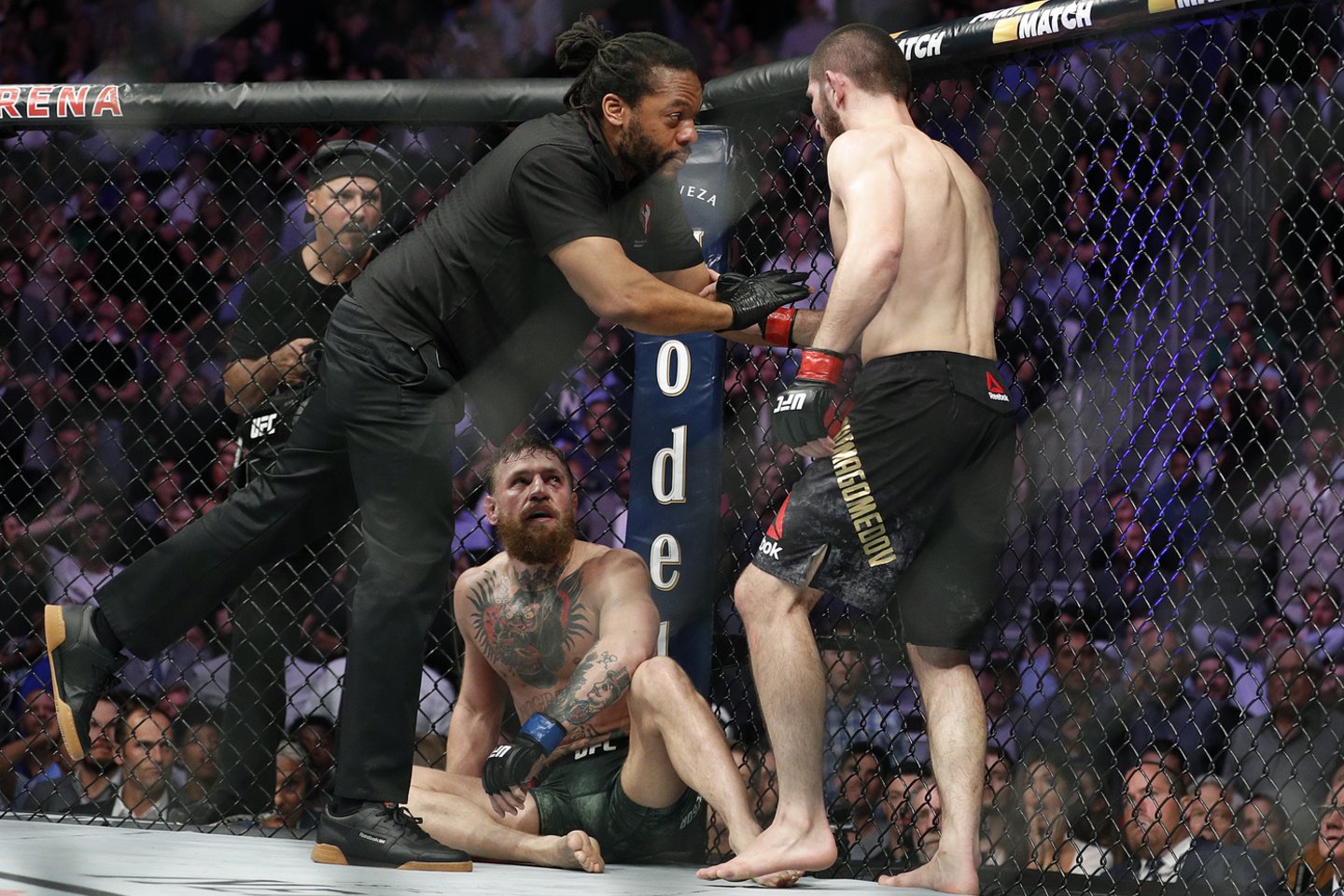 Vos tik paskelbus nugalėtoją, H.Nurmagomedovas sukėlė arenoje riaušes – jis sviedė dantų kapą į švilpiančius žiūrovus, perlipo ringo aptvarą ir metėsi tarp žiūrovų, kad galėtų vieną ar kitą sumušti.