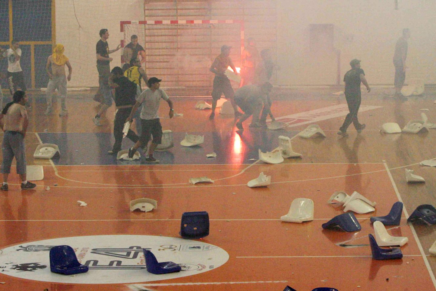 Ketvirtosiose finalo rungtynėse, kurios vyko Atėnų olimpinės arenos mažojoje salėje, AEK rankininkai nesugebėjo pasipriešinti varžovams iš Pirėjo. Dėl jų palaikomos komandos bejėgiškumo įsiaudrinę sirgaliai pyktį išliejo ant varžovų. AEK aistruoliai pradėjo mėtyti į „Olympiakos“ rankininkus įvairius daiktus, o 53-iąją min. keliolika žiūrovų įsiveržė į aikštę ir teisėjai nutraukė mačą.