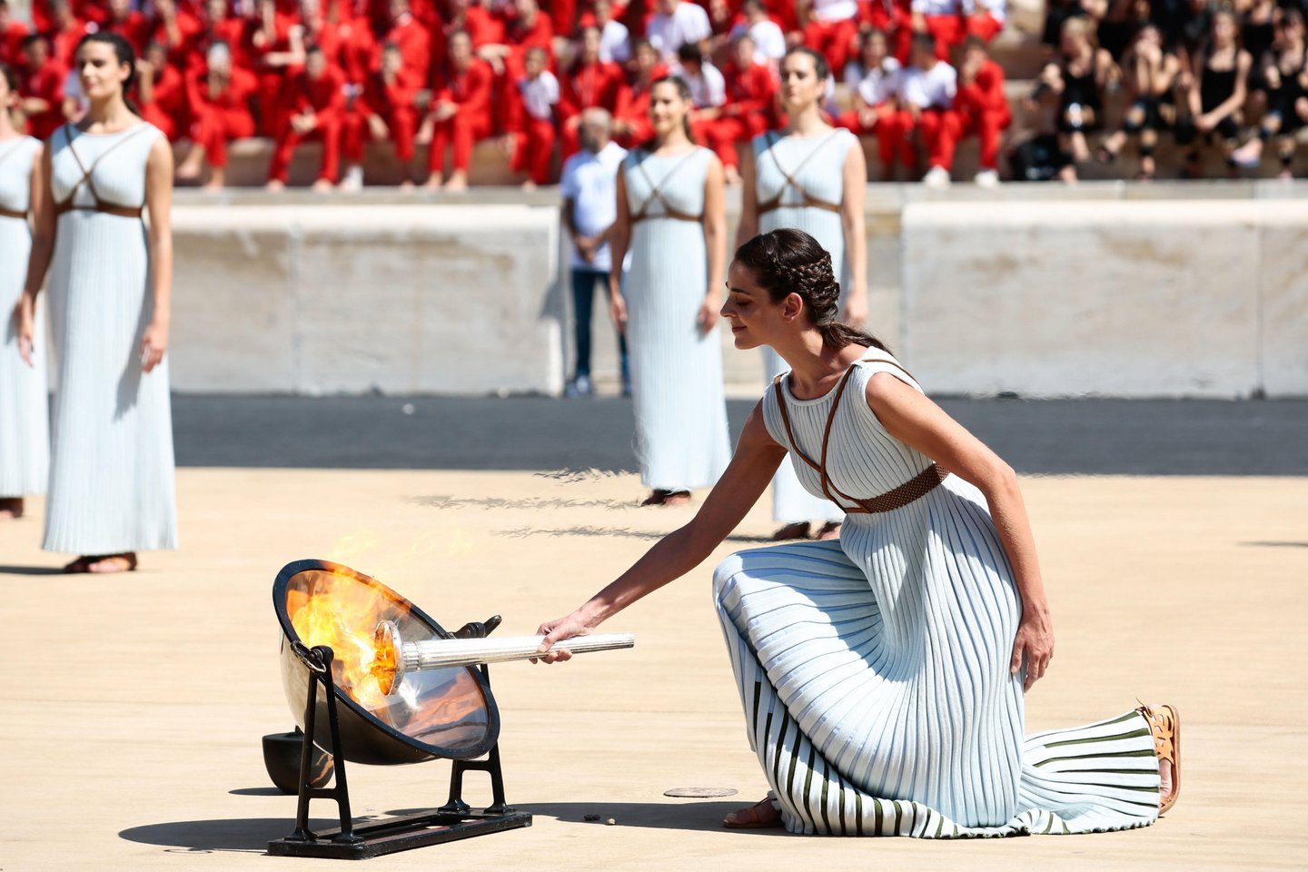 Nestebint žiūrovams olimpinės gimnastikos čempionas Elefterijus Petrunijas nešdamas deglą apibėgo ratą, o šuolių su kartimi olimpinė čempionė Katerina Stefanidi uždegė katilą marmuriniame stadione „Panathinaiko“, kur 1896 metais įvyko pirmosios šiuolaikinės Olimpinės žaidynės.