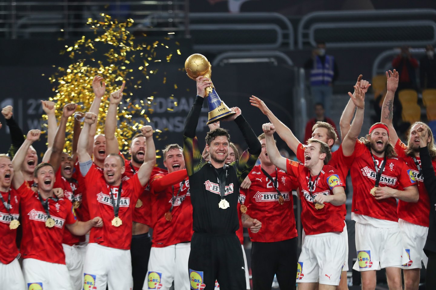 Užpernai Egipte vykusiose pasaulio pirmenybėse aukso medalius iškovojo Danijos rankininkai. Jie finale nugalėjo Švedijos rinktinę. Bronzos medalius iškovojo Ispanijos komanda, mažajame finale įveikusi Prancūzijos ekipą.