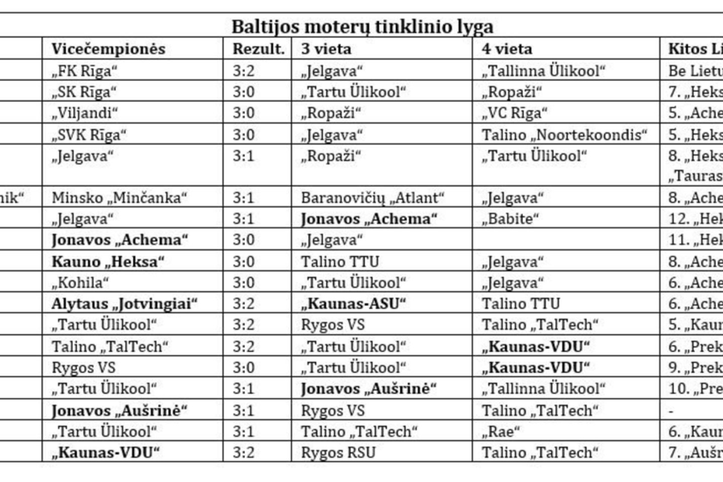 Lentelė: „Aistės“ – 10/10, „Panevėžys“ – 8/11, Rygos „TTT Juniores“ – 7/10, „Daugavpils Universitate“ – 5/10, Latvija (iki 16) – 2/8, „Oaks“ – 2/11, Kauno „Atletas“ – 1/10.