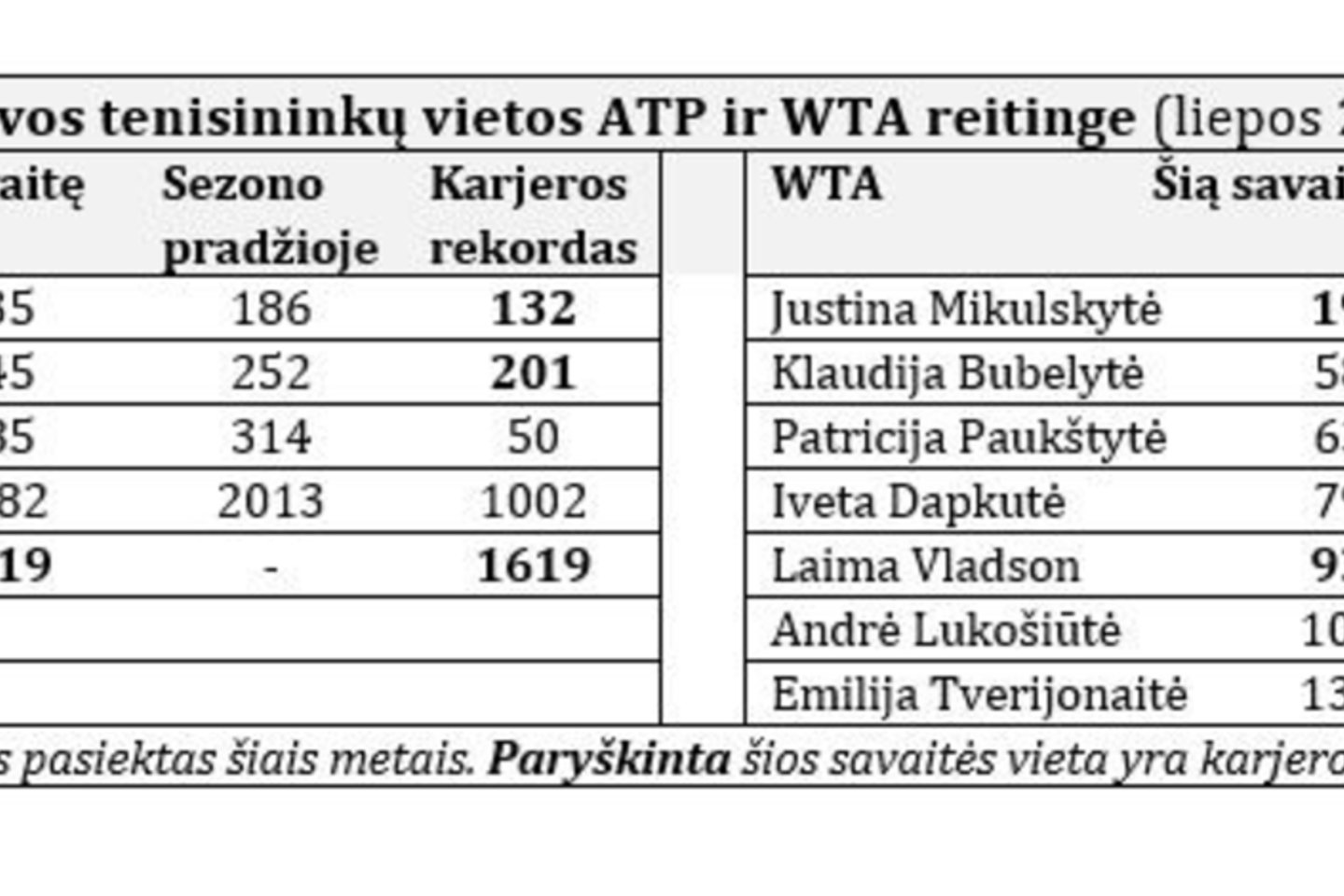 Į WTA reitingo pirmąjį tūkstantuką patenka dar keturios Lietuvos tenisininkės. 22-ejų Klaudija Bubelytė užima 587-ąją vietą, 20-metė Patricija Paukštytė – 636-ąją vietą, 32 metų Iveta Dapkutė – 796-ąją vietą, 17-metė Laima Vladson – 933-iąją vietą.