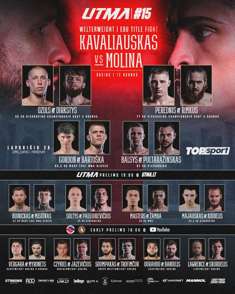 Žiūrovų lauks dvi titulinės UTMA kovos – dėl 77 kg kikbokso čempiono diržo kausis Dovydas Rimkus ir Mantvydas Perednis, o dėl 86 kg kikbokso čempiono diržo kausis organizacijos P4P reitingo lyderis Dominykas Dirkstys ir nokautu Vilnių stebinęs latvis Ričards Ozols.