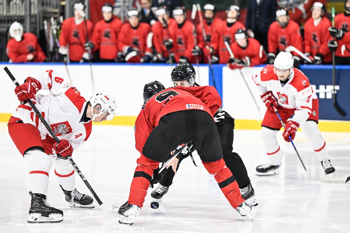 Pirmajame kėlinyje Lenkijos U20 rinktinė turėjo progą kelias minutes pasiausti ant ledo, kol išsijudino mūsiškiai. Kėlinio viduryje lietuviai pradėjo kurti progas ir žaidimas persikėlė į varžovų aikštės pusę. Pijus Pranskevičius, Algirdas Jaras, Mykolas Škadauskas pavojingais metimais grasino varžovų vartams, tačiau įvarčio pasiekti nepavyko.