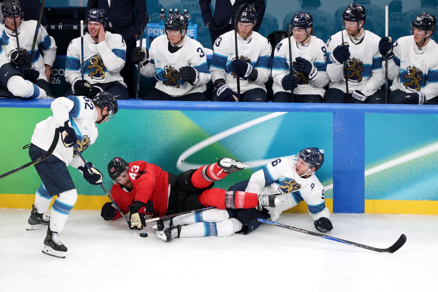 Olimpinių čempionų titulą gynę Suomijos ledo ritulininkai dar pirmajame kėlinyje pritildė Milano arenos tribūnas užpildžiusių Kanados sirgalių triukšmą.