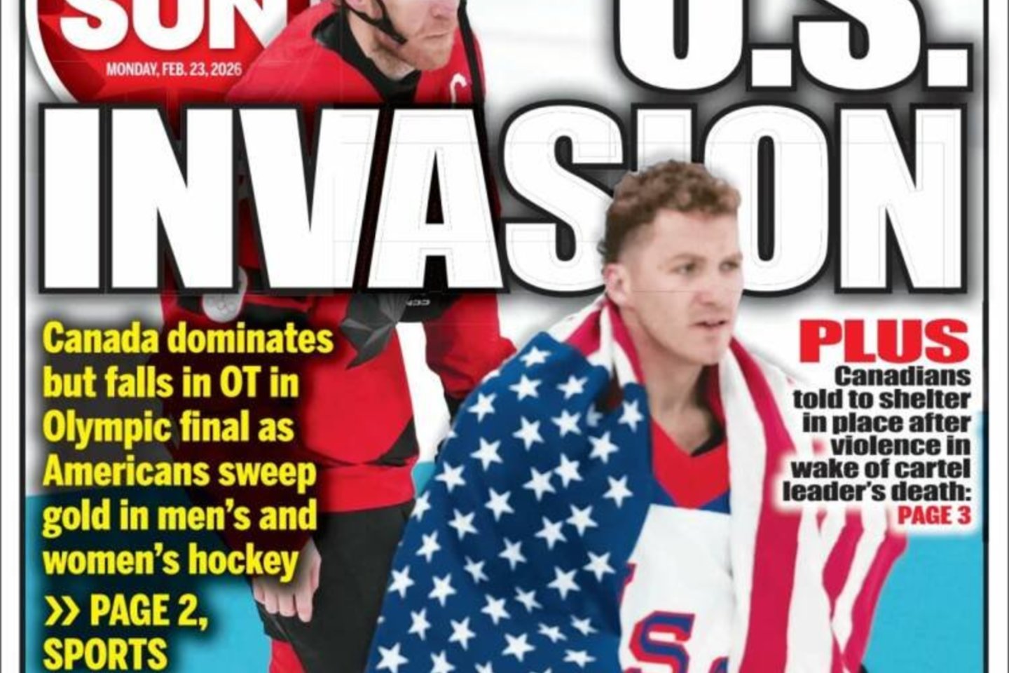 „JAV invazija“, – didelėmis viršelyje parašytomis raidėmis savaitgalio emocijas pirmadienį perteikė „Toronto Sun“ dienraštis. „Kanada vyravo, bet krito olimpinio finalo pratęsime, o amerikiečiai susižėrė vyrų ir moterų ledo ritulio auksą“, – pranešė „Toronto Sun“.