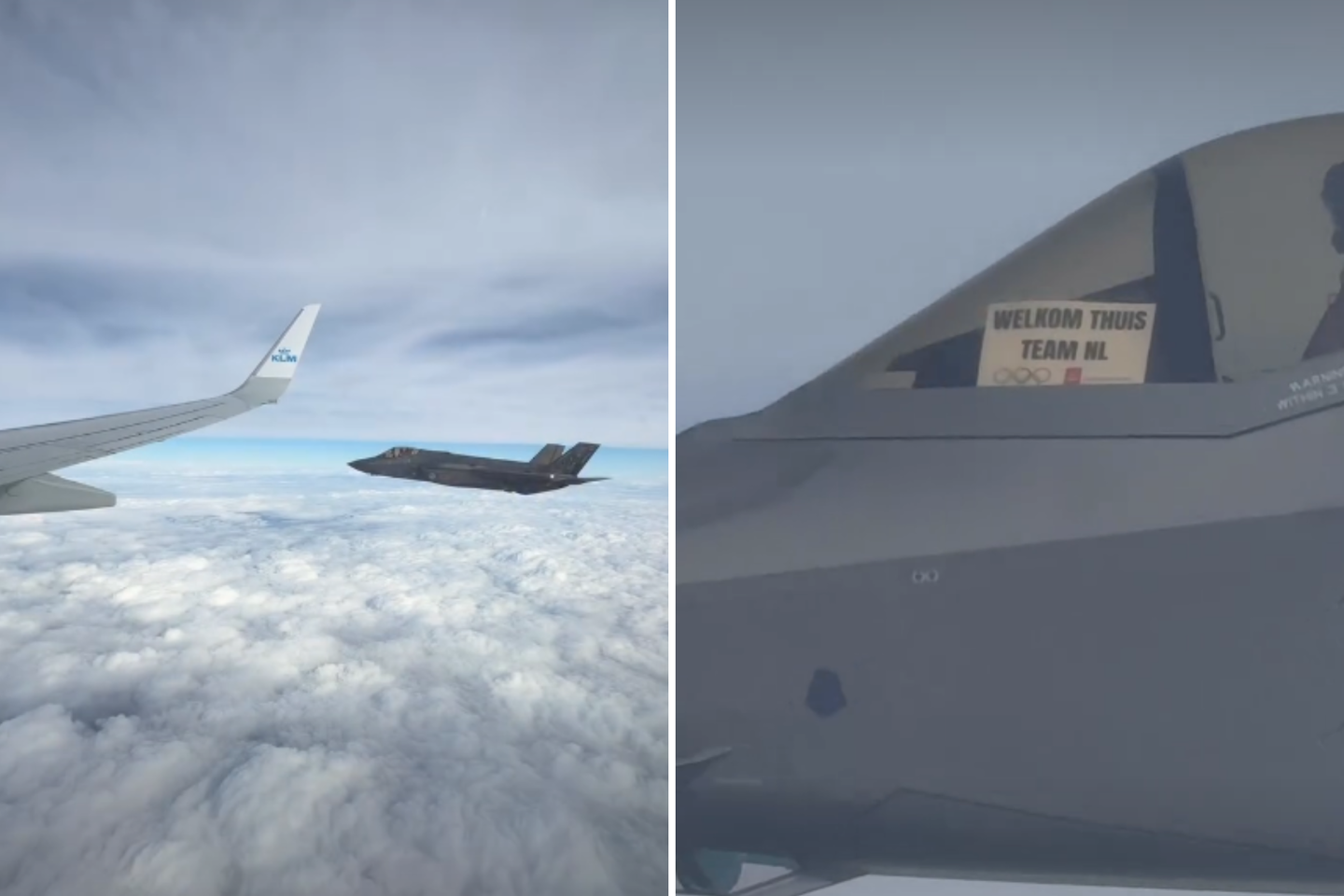 Nyderlandų oro bendrovės „KLM“ skrydžiu grįžtančius olimpiečius ore pasitiko F-35 naikintuvas, laikomas vienu pažangiausių visame pasaulyje.