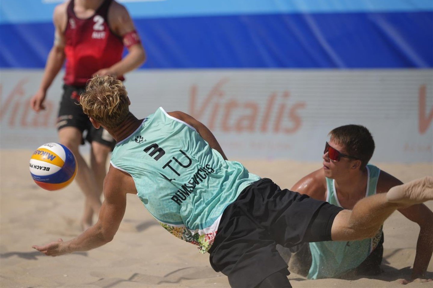 Aštuntfinalyje A. Rumševičius ir K. Palubinskas po atkaklios kovos, trukusios 44 min., 2:1 (21:13, 13:21, 15:10) įveikė amerikiečius Alexą Ukkelbergą ir Riley Oweną.