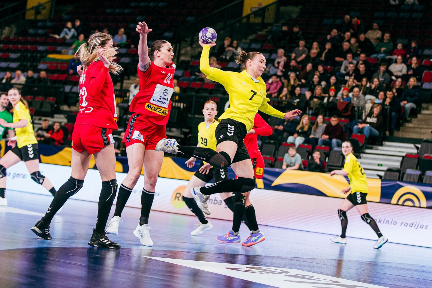 Susitikimo pradžioje abi komandos keitėsi tiksliomis atakomis ir iki pertraukos net 13 kartų švieslentėje degė lygus rezultatas. Viešnios geriau pradėjo rungtynes, bet lietuvės neleido joms atitrūkti ir įpusėjus kėliniui pirmą kartą persvėrė rezultatą 12:11. Lietuvėms dar kelis kartus pavyko pirmauti vienu įvarčiu, bet kėlinio pabaigoje varžovės perėmė iniciatyvą 20:18.