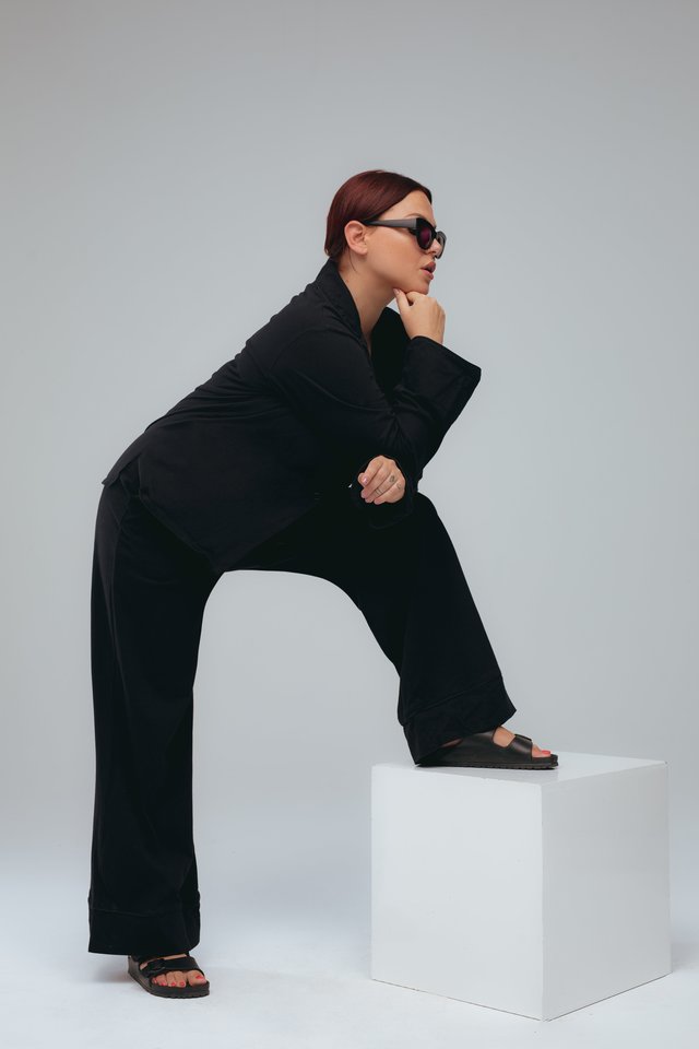 Prie Justės kurto kostiumėlio tinka ir aukštakulniai, ir sportinio stiliaus batai. Visi dydžiai – vadinamieji „oversize“, medžiagos švelnios, tobulai krintančios, kad vasaros vėjas galėtų bučiuoti kiekvieną kūno milimetrą.