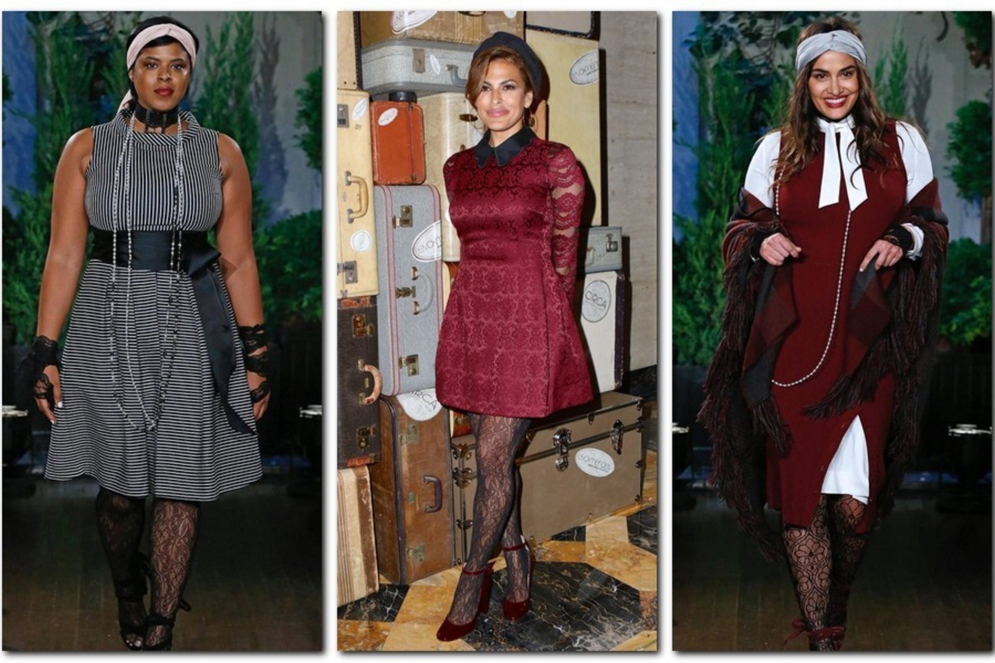 E.Mendes pasirinko galingą renginį – Niujorko mados savaitę. Pasitempusi ir grakšti su vyšnine suknele, ažūrinėmis kojinėmis ji atrodė puikiai. Tarp kitko, ažūrines kojines priderinti – aukštasis stiliaus pilotažas, paprastai jos atrodo vulgariai.