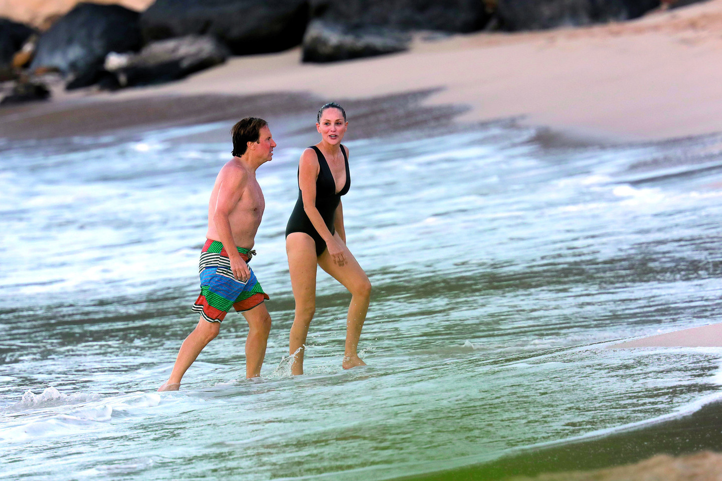 Fotografai užfiksavo, kaip įsimylėjėliai nerūpestingai leidžia laisvalaikį paplūdimyje. Sharon atrodė žavi ir laiminga.
