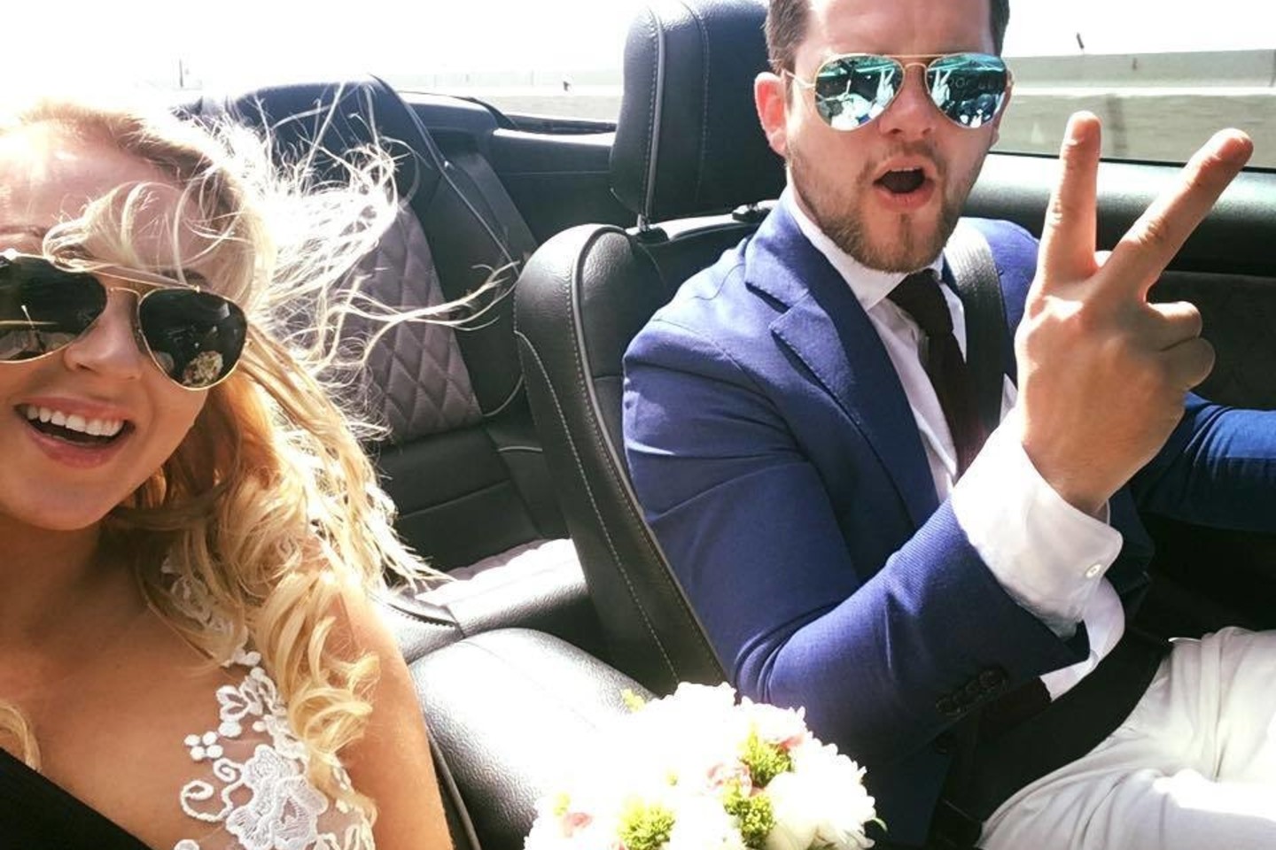 Pora ceremonijai pasirinko galingą „Mustang“ automobilį. Eglės suknelė buvo puošta nėriniais, o abiejų veidus puošė ne tik šypsenos, bet ir akiniai nuo saulės.