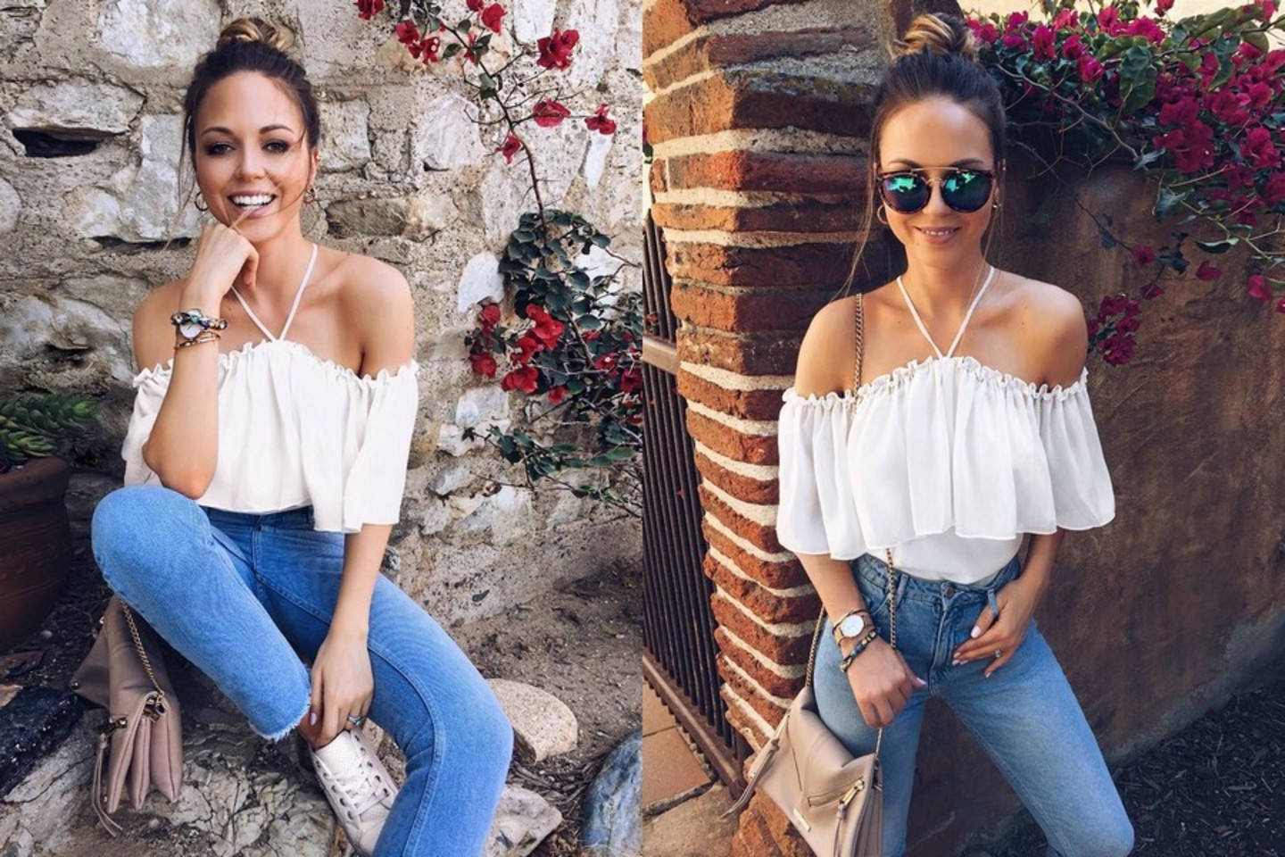 Nuotraukai Evelina pasipuošė aptemptais džinsais, prie kurių priderino baltą, pečius apnuoginusią palaidinę.