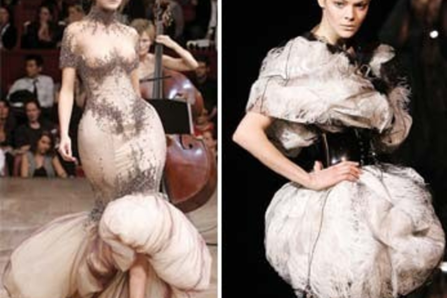 Jei viena suknelė nebūtų sidabrinė, o kita – juoda, pamanytum, ta pati. Tos pačios rauktos gėlės, taip pat sudėtos ant perregimo pagrindo ir taip pat panaudoti vadinamieji metalo kaulai.