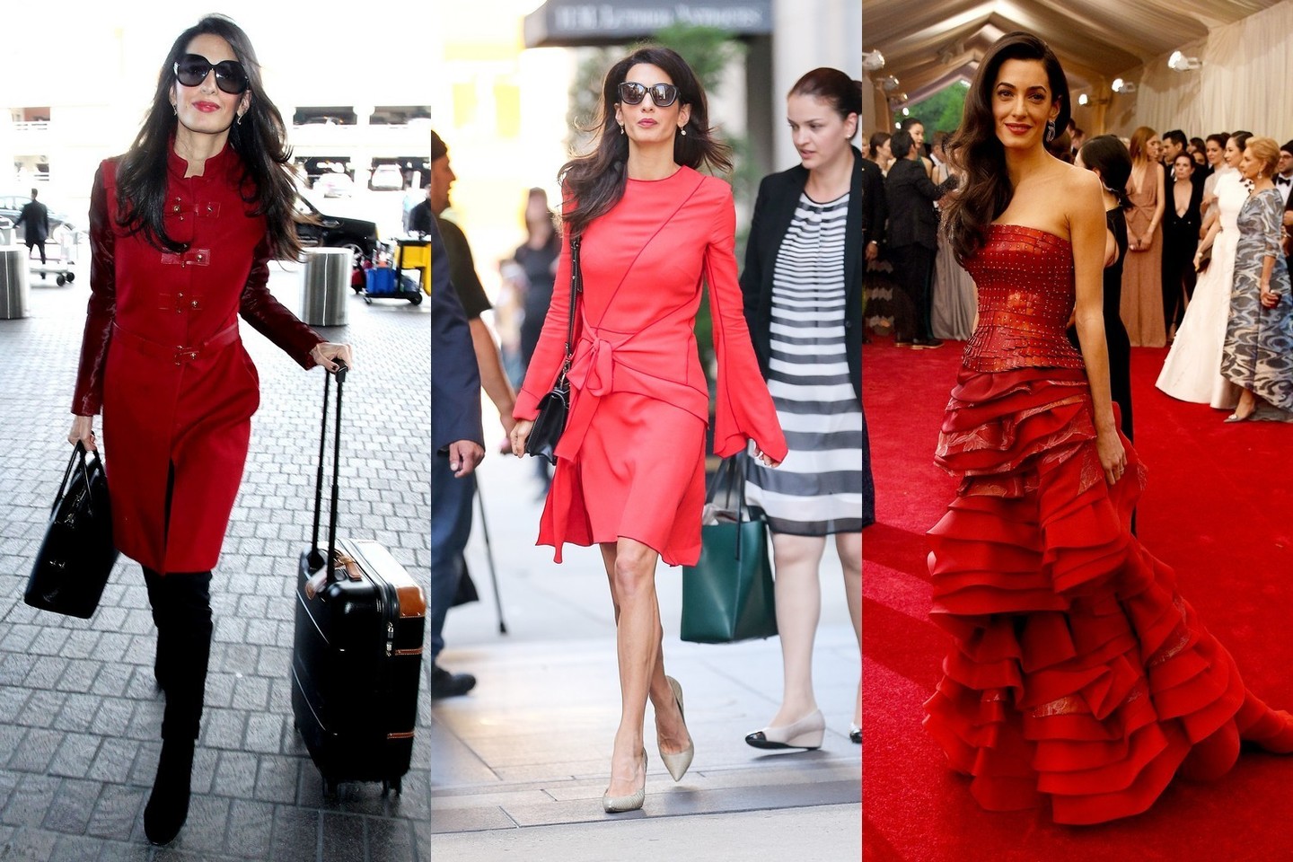 Tiek visiškai raudonos, tiek raudonai margintos suknelės Amal tiko tobulai. Kokia jos paslaptis?