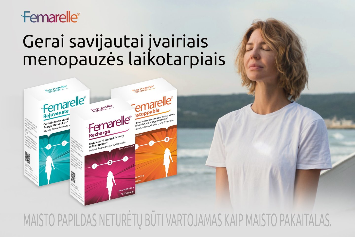 Femarelle® Rejuvenate yra maisto papildas, skirtas savijautai pagerinti, gerai odos būklei palaikyti ir nuovargiui mažinti perimenopauzės laikotarpiu.