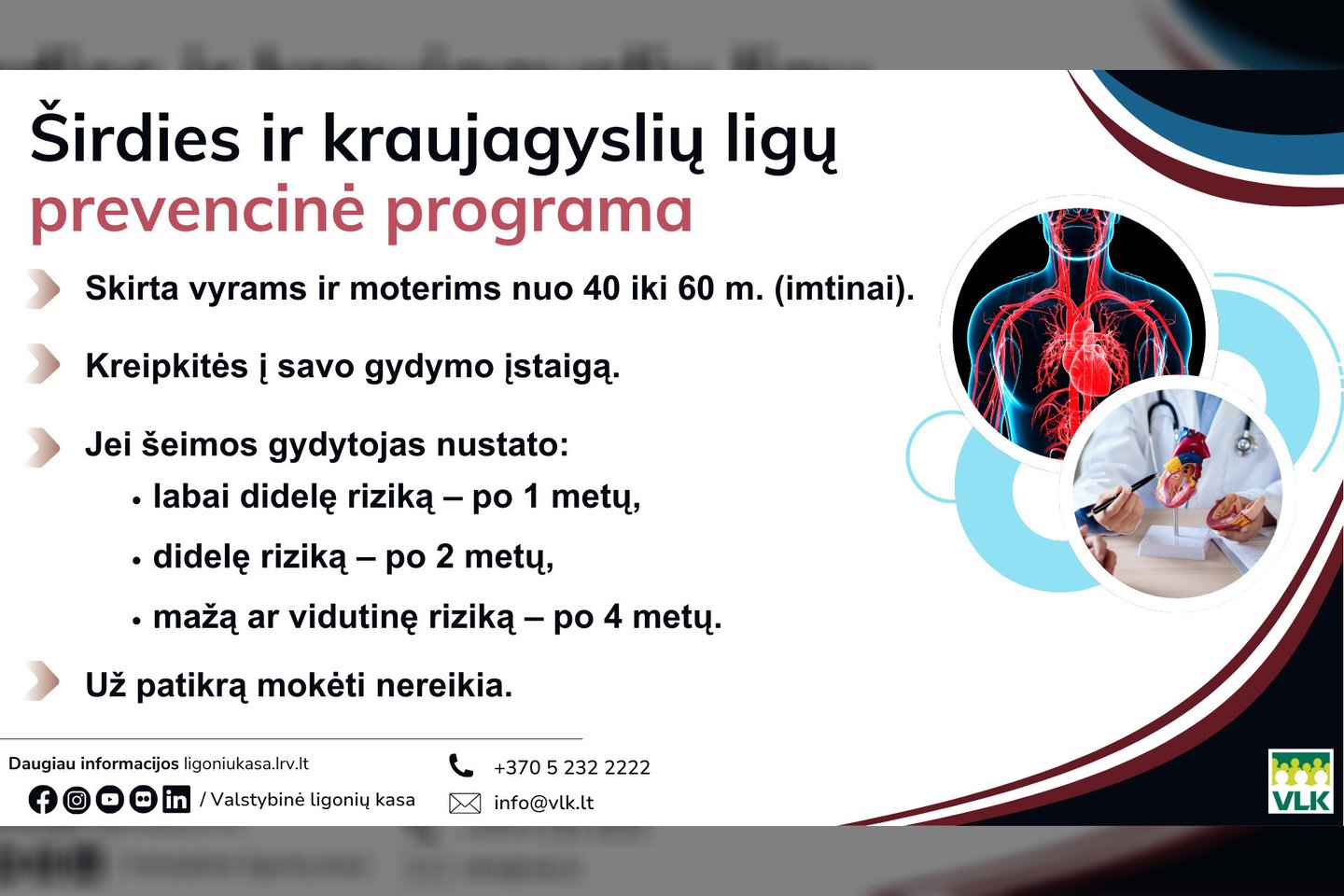 Širdies ir kraujagyslių ligų prevencinė programa Lietuvoje vykdoma jau 20 metų. Ji skirta nuo 40 iki 60 metų (imtinai) vyrams bei moterims. Programos metu šeimos gydytojas skiria atlikti įvairius tyrimus – kraujo, širdies veiklos ir kitus. Gavęs rezultatus, jis įvertina riziką sirgti širdies ir kraujagyslių ligomis: nustatoma maža, vidutinė, didelė arba labai didelė rizika. Nuo to priklauso, kaip dažnai žmogui reikės tikrintis – kas ketverius, kas dvejus metus ar kasmet.