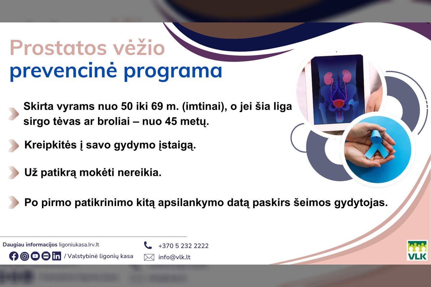 Visi 50–69 metų amžiaus vyrai gali nemokamai pasitikrinti. Anksčiau mano minėtoje rizikos grupėje esantys vyrai šioje programoje dalyvauti kviečiami nuo 45-erių.