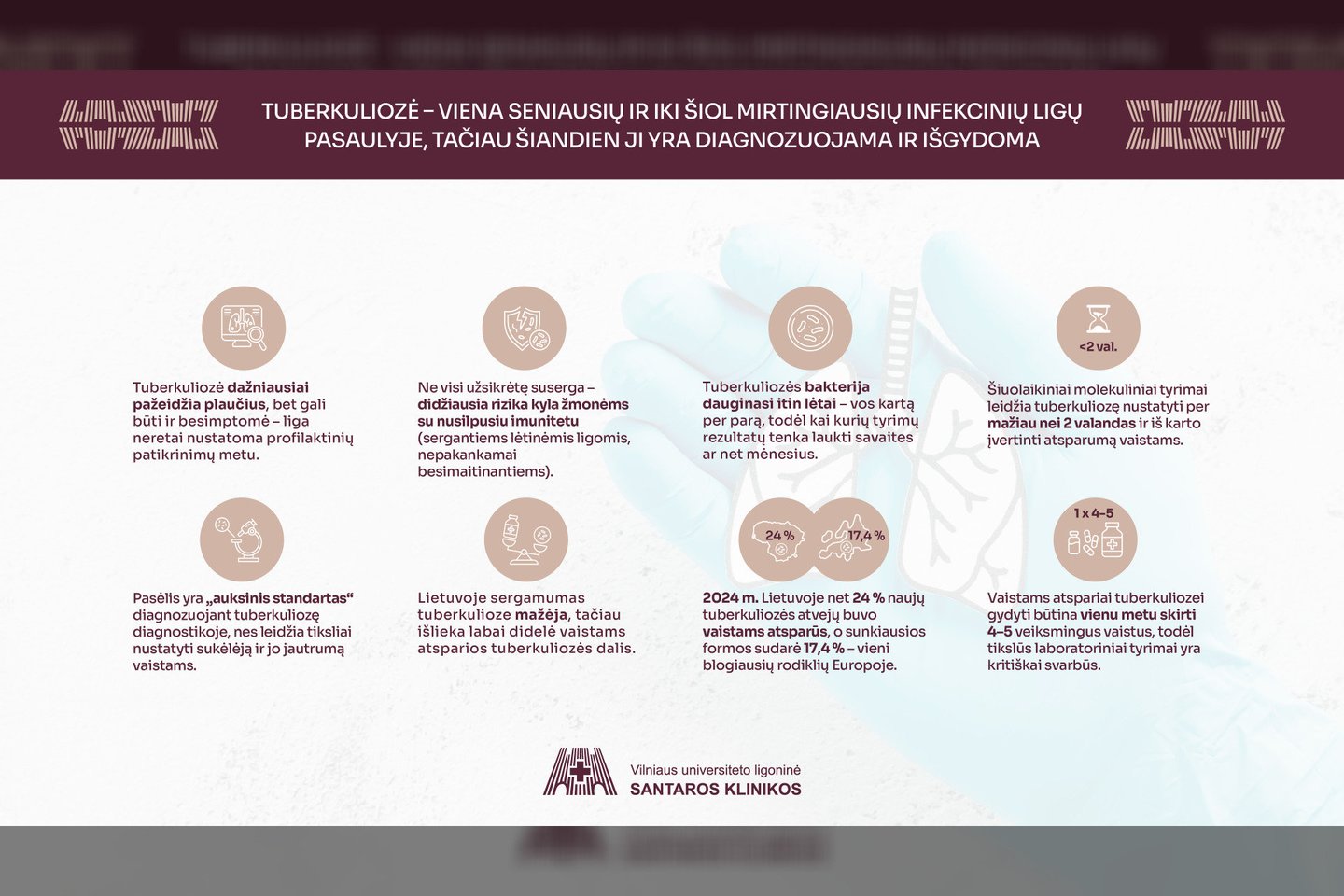 Laima Vasiliauskaitė: Europos ligų prevencijos ir kontrolės centro duomenimis, ekstrapulmoninė tuberkuliozė sudaro bent 15 proc. atvejų ES ir EEE šalyse, tačiau Lietuvoje – tik apie 7 proc. Todėl kviečiu įvairių sričių specialistus, kilus įtarimui ar klausimams dėl ėminių paėmimo, drąsiai kreiptis į mūsų laboratoriją. Kontaktus galima rasti Santaros klinikų interneto svetainėje.