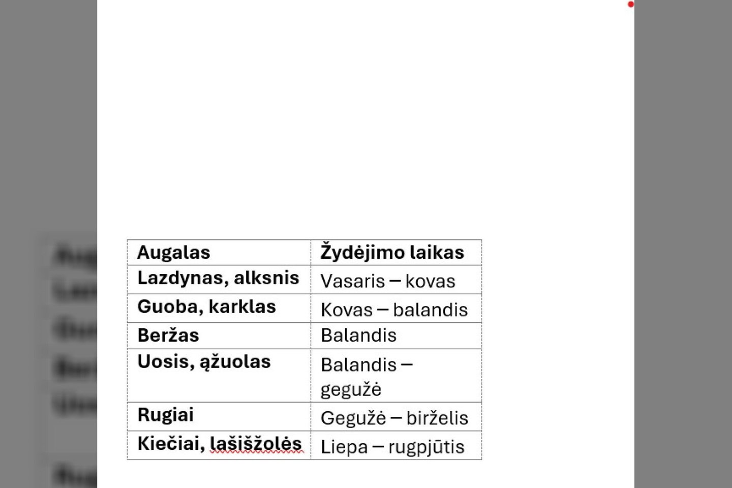 Lietuvoje žiedadulkių sezonas trunka beveik pusmetį – nuo vasario pabaigos iki rugpjūčio. Svarbu žinoti, kuris augalas žydi, kuriuo metu, nes alergija dažnai būna specifinė: žmogus gali reaguoti į beržą, bet žolių žiedadulkes nesukelia simptomų, arba atvirkščiai.
