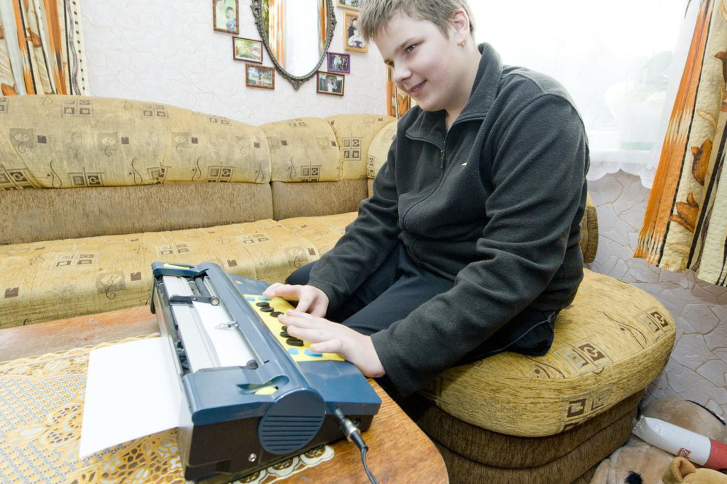 Tik per pamokas jis rašo ne sąsiuvinyje, o naudojasi specialia mašinėle. Kaukšėdamas klavišais paauglys Braille’io raštu pasižymi, kas užduota rytdienai.