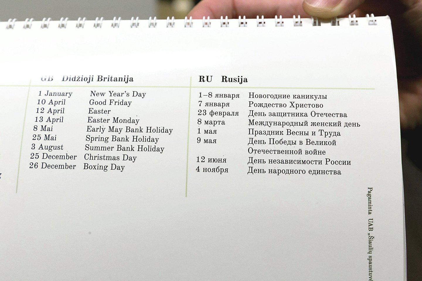 VLK užsakymu kalendorių su informacija apie Rusijos, Vokietijos ir Didžiosios Britanijos valstybines šventes išleidusios Šiaulių spaustuvės vadovas Stanislovas Dikšas „Lietuvos rytui“ teigė, kad panašių leidinių pageidauja verslo ryšių su šiomis šalimis turintys klientai.