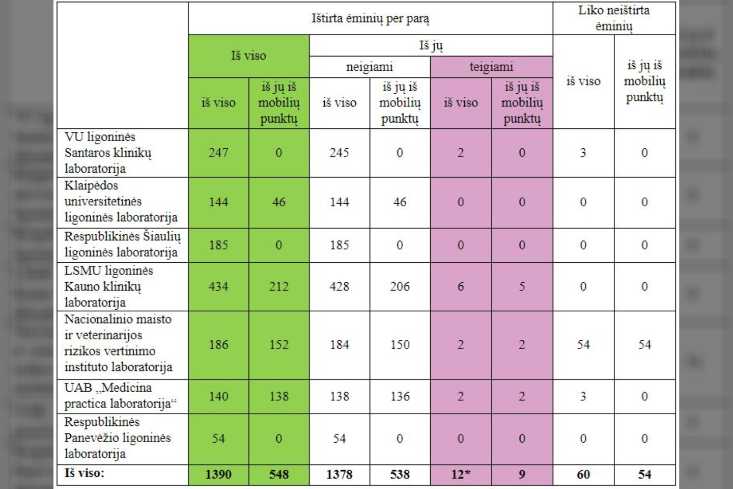 Izoliacijoje šiuo metu yra 144 asmenys. Per praėjusią parą laboratorijose ištirti 1390 ėminių, iš viso iki šiol ištirta 527729 ėminiai.