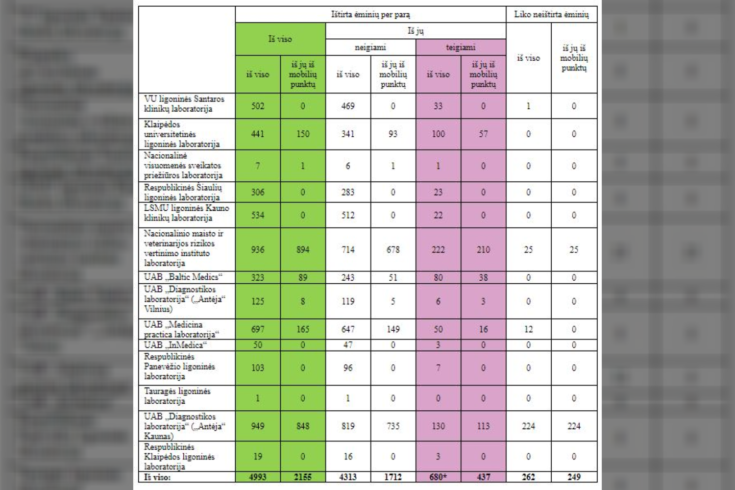 Per pirmadienį iširti 4993 ėminiai. Iki šiol ištirti 103 8164 ėminiai.
