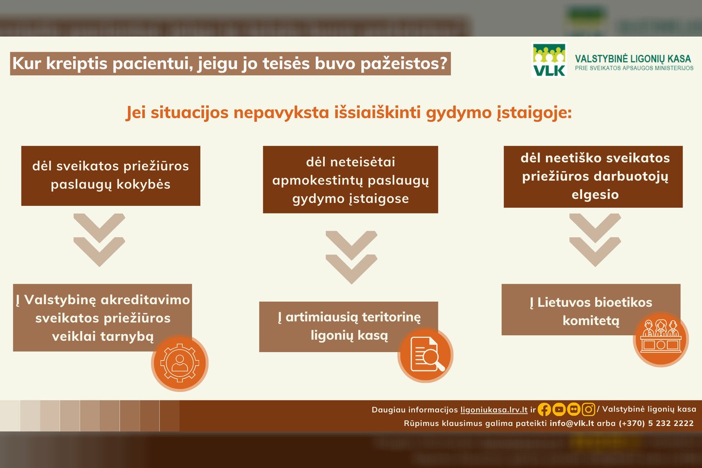Esant neaiškumų dėl gydymo įstaigoje teikiamų paslaugų, mokėjimų ar specialistų, pacientai pirmiausia turėtų raštu kreiptis į gydymo įstaigos administraciją. Jeigu gautas gydymo įstaigos atsakymas netenkina, galima kreiptis į už konkrečią sritį atsakingas valstybės įstaigas, kartu pateikiant ir netenkinantį gydymo įstaigos atsakymą.